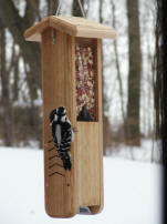 SUET FEEDER $29.00 (includes shipping) Add to order Review order | Don�t forget the woodpeckers (and chickadees, nuthatches, and titmice)! This "Woodpecker Feeder" holds peanut pieces or woodpecker mix. The cedar "Suet Feeder" holds two cakes of suet and the tail prop is long enough to support a pileated woodpecker! |