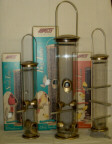 | Tube feeders attract the smaller backyard songbirds - chickadees, titmice, finches, nuthatches. Fill tube feeders with black oil sunflower seed or use safflower seed if squirrels are a problem. Tube feeders made by Aspects have become our favorites and best sellers! Aspects tubes are made of super-tough polycarbonate; the die cast top and bottom have an antique brass finish. For feeding sunflower seed, safflower seed or a high quality mixed seed, choose either the �Big Tube Feeder� which has 6 feeding stations and holds 3� quarts of seed or the �Medium Seed Tube� which holds 1� quarts and has 4 feeding stations. For feeding nyjer seed (thistle) to attract goldfinches, the �Medium Thistle Feeder� has 8 feeding stations and holds 1� quarts. To catch spilled seed and provide a feeding platform for cardinals, you can add Aspect�s 8" �Seed Tray� to any of these feeders.