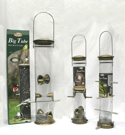 Tube feeders attract the smaller backyard songbirds - chickadees, titmice, finches, nuthatches. Fill tube feeders with black oil sunflower seed or use safflower seed if squirrels are a problem. Tube feeders made by Aspects have become our favorites and best sellers! Aspects tubes are made of super-tough polycarbonate; the die cast top and bottom have an antique brass finish. For feeding sunflower seed, safflower seed or a high quality mixed seed, choose either the “Big Tube Feeder” which has 6 feeding stations and holds 3½ quarts of seed or the “Medium Seed Tube” which holds 1¼ quarts and has 4 feeding stations. For feeding nyjer seed (thistle) to attract goldfinches, the “Medium