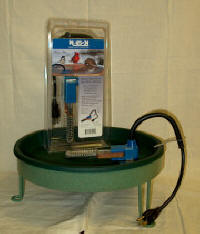It is often said that by providing a water source you can attract more birds than with a birdfeeder; not all birds will visit a feeder but they all require water! Here are our two best selling birdbaths. The "Erva Deck Mount" birdbath has a light green powder coated steel rim with a 14" dark green plastic insert for year round use. Also, available in a hanging model. The "Looker Hanging Classic" birdbath has a cedar, geometric rim with a 17" terra cotta plastic insert for year round use. During the winter months, birds need a source of water. The "Nelson Blue Devil Birdbath Heater" works in all birdbaths - plastic, pottery, or concrete - even in sub-zero temperatures. The thermostat conserves energy and the heater shuts off when the birdbath is out of water. The Nelson carries a full four-year warranty! |