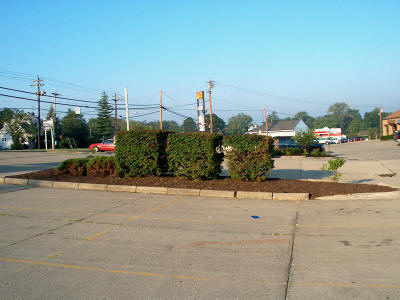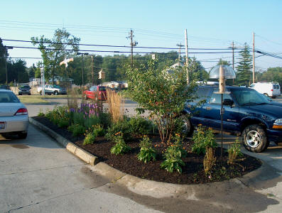 Parking Lot Garden - BEFORE | During the summer of 2005 Wild About Birds "adopted" one of the parking lot islands in front of the shop. We landscaped the island with bird friendly plants, a birdfeeder, nesting box and birdbath. The plants we included are serviceberry, China holly, feather reed grass, purple coneflower, black-eyed Susan, aster, yarrow, liatris, coreopsis, and mullien. We also have a new bench on the sidewalk in front of the shop and we can lend you a pair of binoculars, so come on over and watch the birds! |  Parking Lot Garden - AFTER!!! |  | | | Our garden has really taken off this year - as you can see from this photo! We are attracting several different species of birds to our feeders and birdbath: House Sparrow, House Finch, American Goldfinch, Northern Cardinal, Northern Mockingbird, European Starling, American Robin, Common Grackle, Mourning Dove, Ruby-throated Hummingbird (we have a hummingbird feeder both in the garden and on the sidewalk in front of the shop - the hummers visit both feeders regularly), Red-bellied Woodpecker (a rare visitor last fall & winter). |
